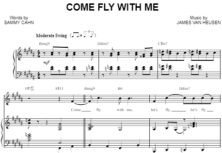 Swing is referred to as both a feel and a rhythmic style, so as a musician it’s important to be able to convey that feeling and rhythm when it’s indicated in music. Most times you will see the tempo actually read “swing.” For example, “Come Fly With Me” by Frank Sinatra looks like this: