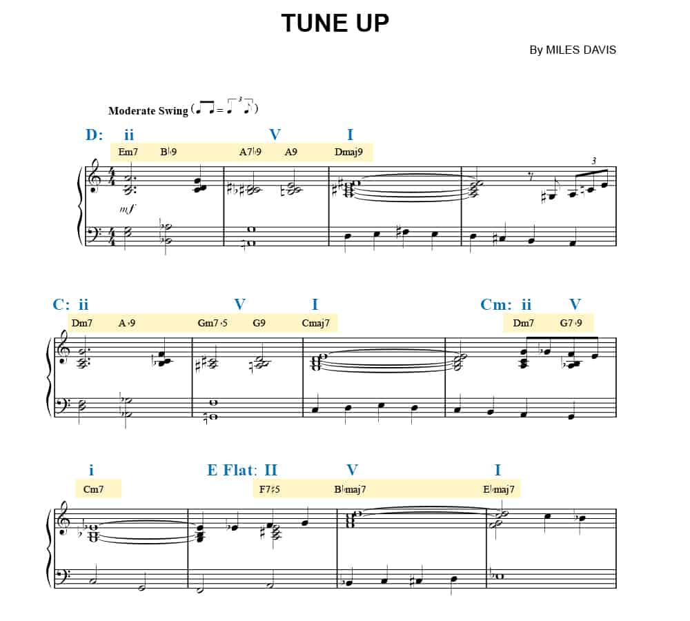 ii-V-I progressions are extremely common in jazz. They serve two primary functions, which are often intertwined: to temporarily imply passing tonalities and to lead strongly toward a goal (the “I” chord). ii-V-I progressions are also commonly used as a progression for which instrumentalists and vocalists can solo over. For example, check out this excerpt of “Tune Up” by Miles Davis: