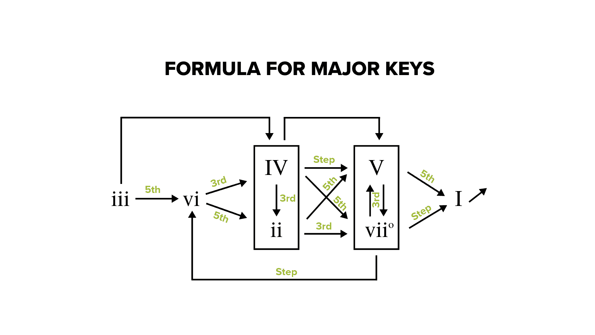Remember, these formulas are not rules, but rather, tools. If you follow these roadmaps, you’re going to come up with chord progressions that sound very pleasant and natural. Let’s review the formula for major keys.