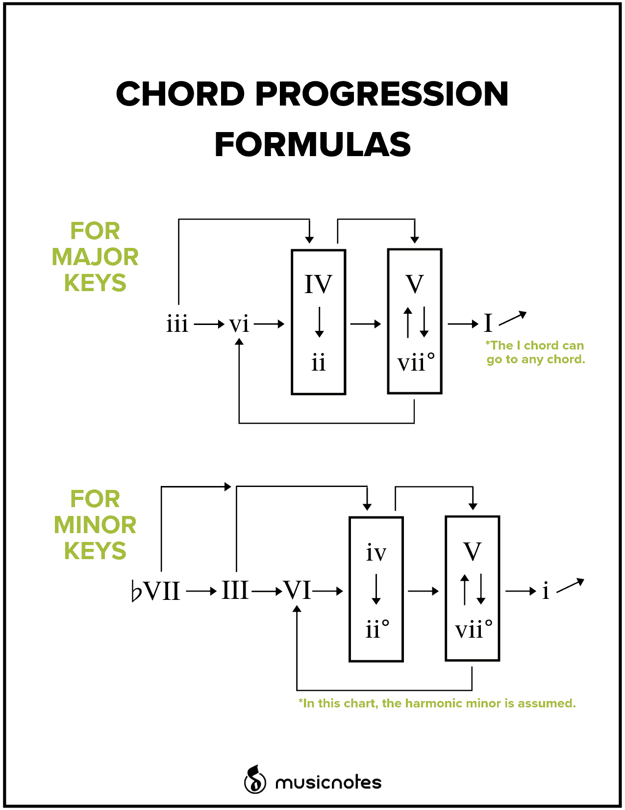 We filmed a short video covering what these formulas are and how to use them, but before you watch, make sure you’ve brushed up on yourRoman numerals. These charts are illustrated with Roman numerals, and we’ve covered what these numbers represent in music inthis blog post.