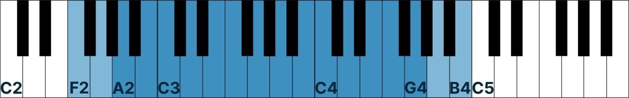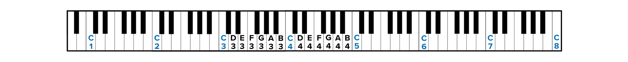 Before we break down each of the voice types, you should be familiar with the numbering system on a keyboard. Talking about notes as “the second A above middle C” can start to get confusing, so a widely used technique is to accompany note names with their given octave number on a keyboard. Middle C is called C4 because it is the 4th C (starting from the Bass) up on the keyboard.