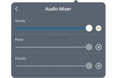 Alternately, the audio mixer is great for learning to sing a cappella (without accompaniment). In many arrangements, you can turn down or turn off the different instruments in the playback. If you turn off everything but the vocals, you can sing along with only the vocal part as your guideline. This is a great step in learning to stay on pitch and in rhythm when singing without accompaniment. Becoming less dependent on instrumental accompaniment is an excellent way to prepare for a performance, and it’s awesome for ear training.