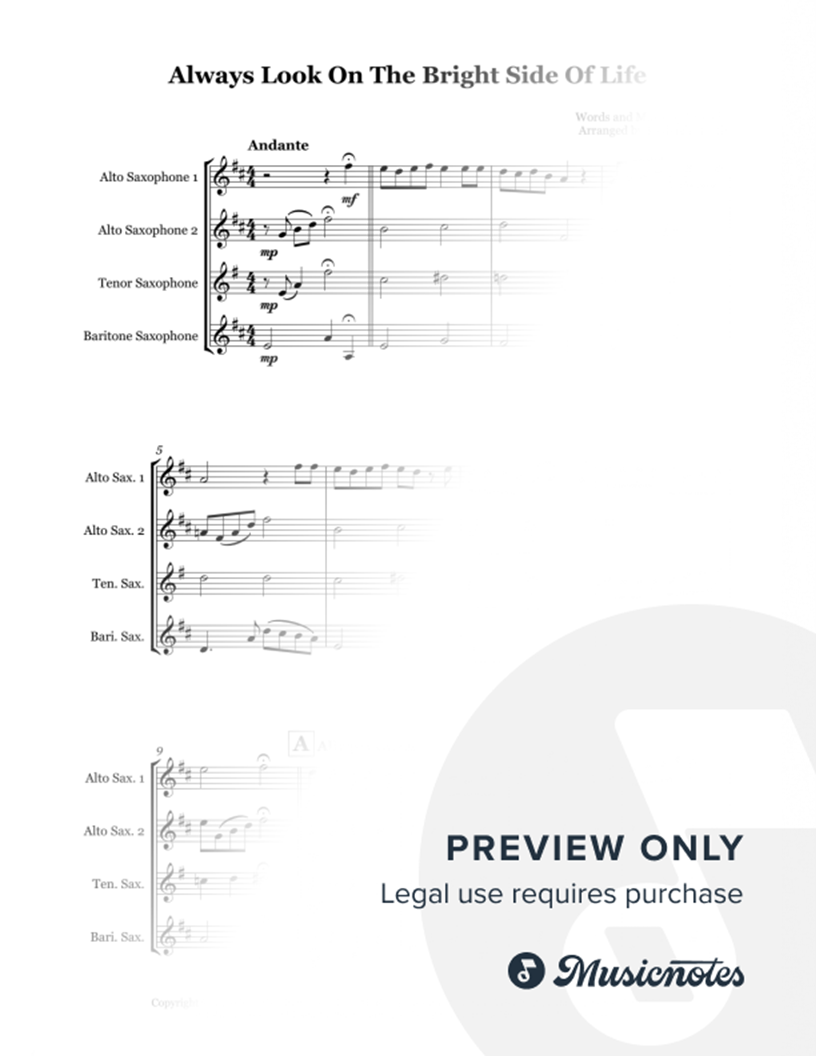 A true classic from Monty Python's The Life of Brian and later Spamalot, 'Always Look on the Bright Side of Life' is a great piece to have in your repertoire - perfect for concerts, parties, funerals, crucifixions .... It will liven up any event! Arranged for AATB saxophone quartet.