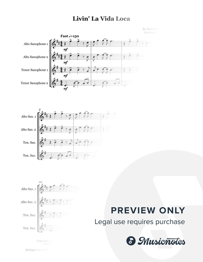 A great Latino pop hit from the end of the nineties, 'Livin' la Vida Loca' is guaranteed to get an audience up and dancing! Arranged for AATT saxophone quartet.