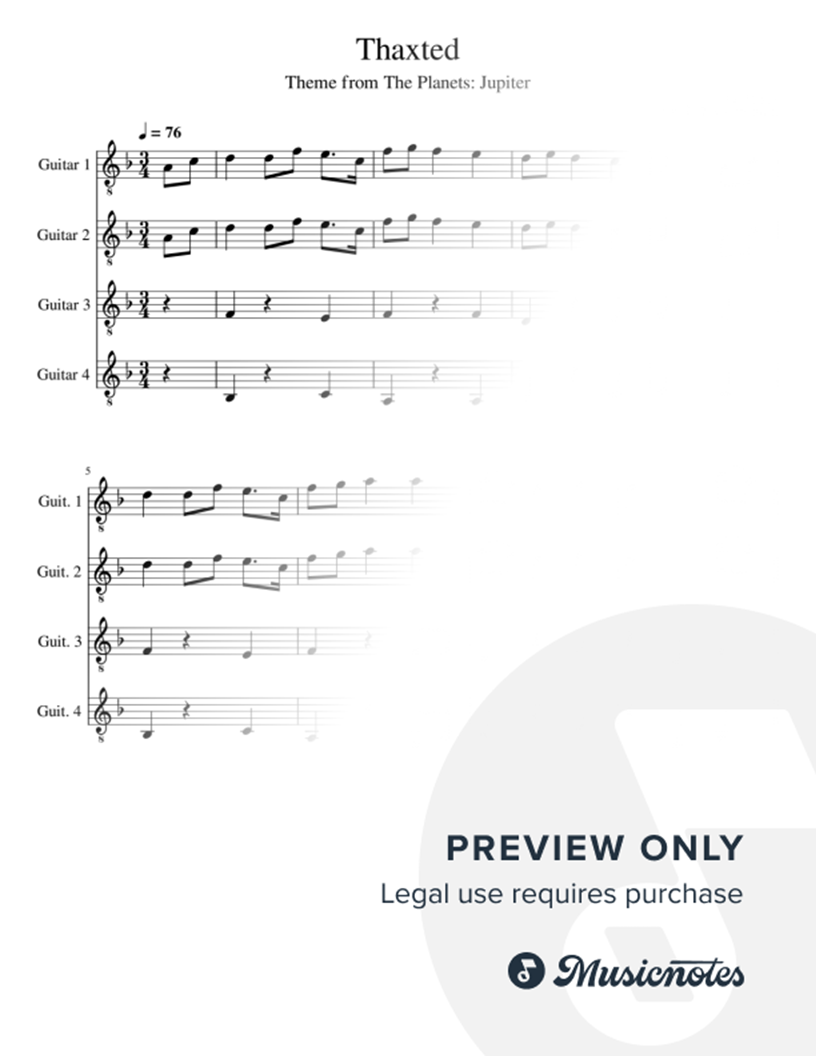 This is a 4 part Guitar Ensemble arrangement of the Thaxted theme from "The Planets: Jupiter" by Gustav Holst. Some parts move up the neck and are considered intermediate difficulty, whereas some supporting parts play the harmonic rhythm in 1st position on the guitar.