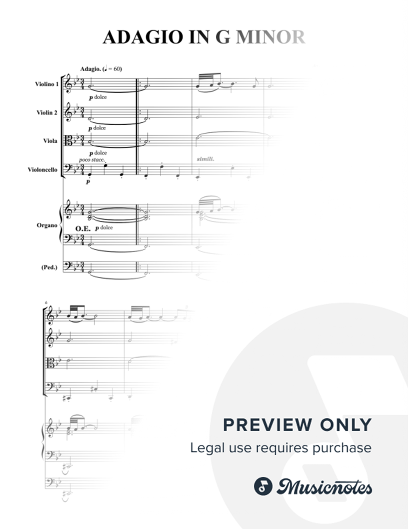 The Adagio in G minor for violin, strings, and organ continuo is a neo-Baroque composition popularly attributed to the 18th-century Venetian master Tomaso Albinoni. Here we present our arrangement for String Quartet and Organ. We hope you enjoy. Intermediate Format: Concert 9 x 12 inches 30 pages.