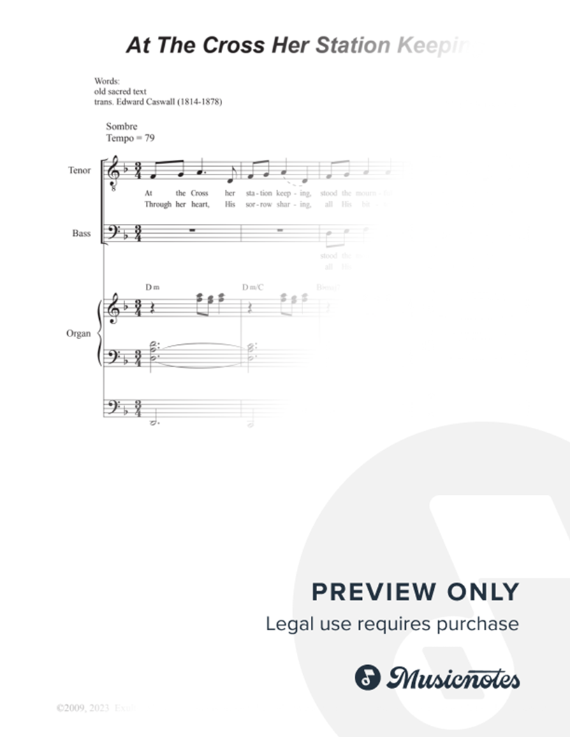 A new, somber moving setting of the hymn that is sung during the Stations of the Cross: a series of fourteen pictures or carvings representing Jesus' progress from his condemnation by Pilate to his crucifixion and burial. Scored as a duet for a Tenor and Bass solo with Organ accompaniment.