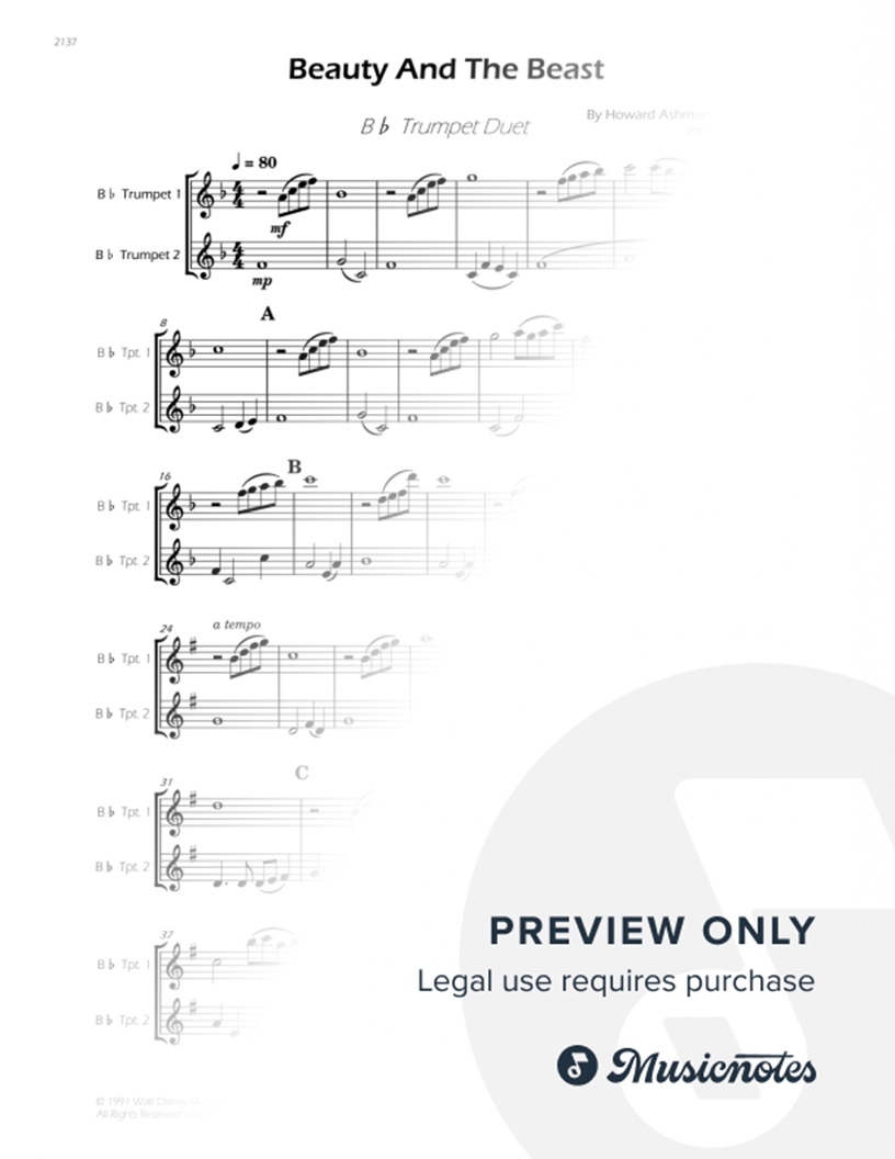 Beauty And The Beast by Alan Menken. Arrangement for Bb Trumpet Duet. With Full Score and Individual Parts. Enjoy it!