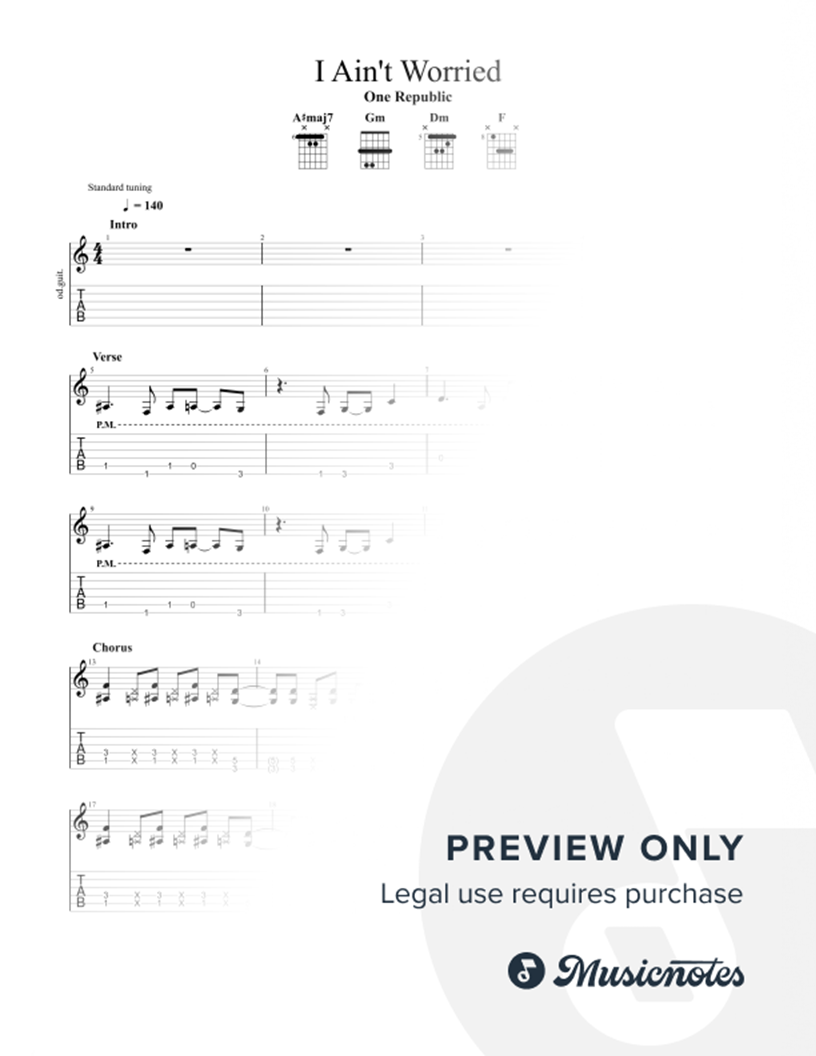 A rock arrangement of I ain't worried by one republic. It uses some power chords in the chorus and incorporates a lead guitar melody to replace the whistling melody in the original song. Makes the song more guitar orientated. Enjoy.