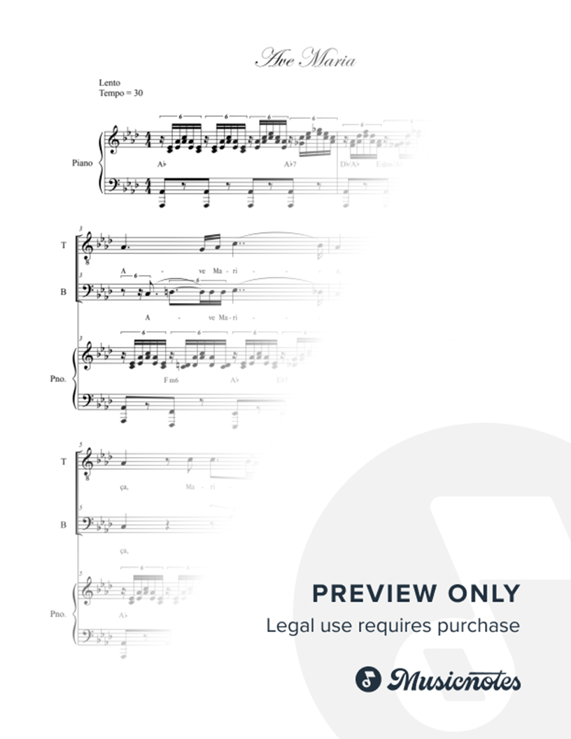 One of Schubert's most popular works, this piece has been adapted by utilizing the Hail Mary Prayer as it is recited in the Portuguese language and has been arranged as a duet for a Tenor and a Bass Solo.