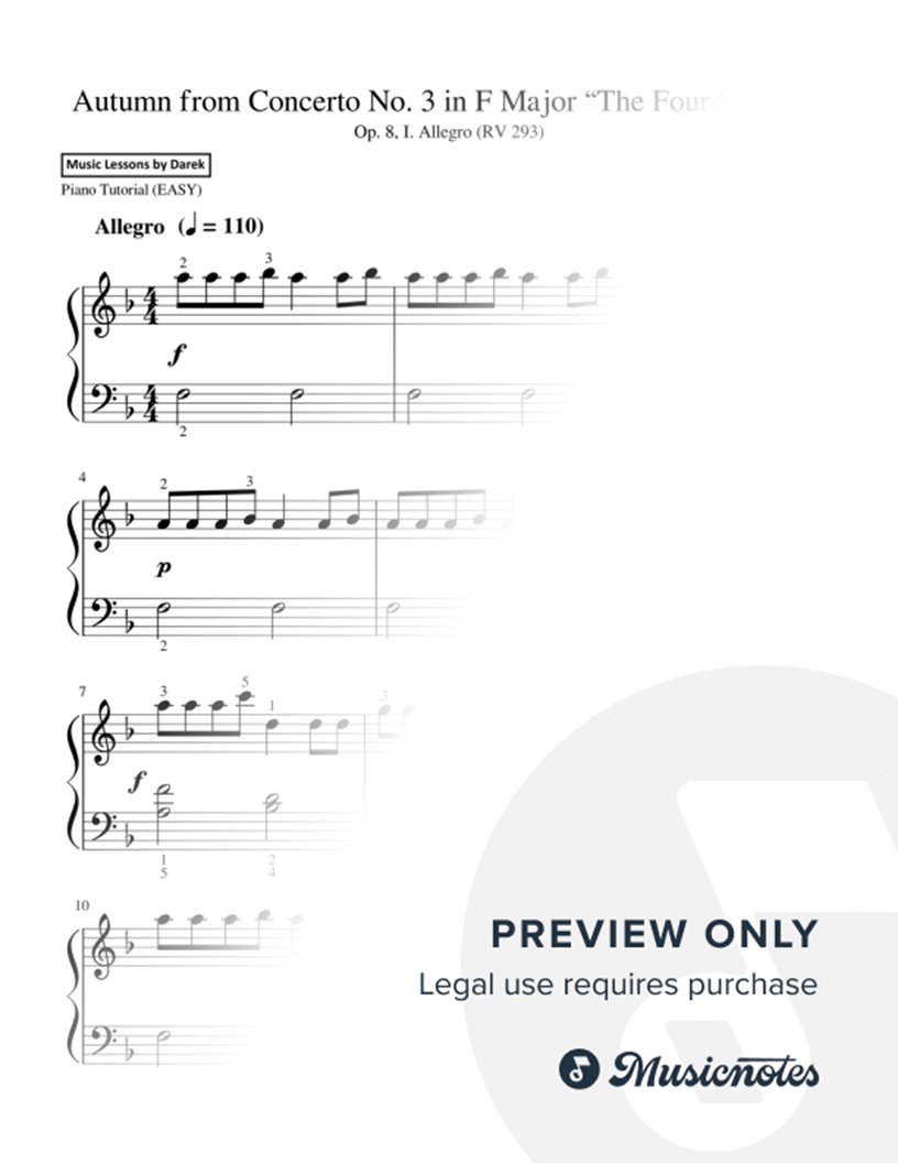 Autumn from The Four Seasons | Easy Piano Sheet Music | Antonio Vivaldi | Concerto No. 3 in F Major Op. 8 [Allegro] (RV 293) | Baroque Music |