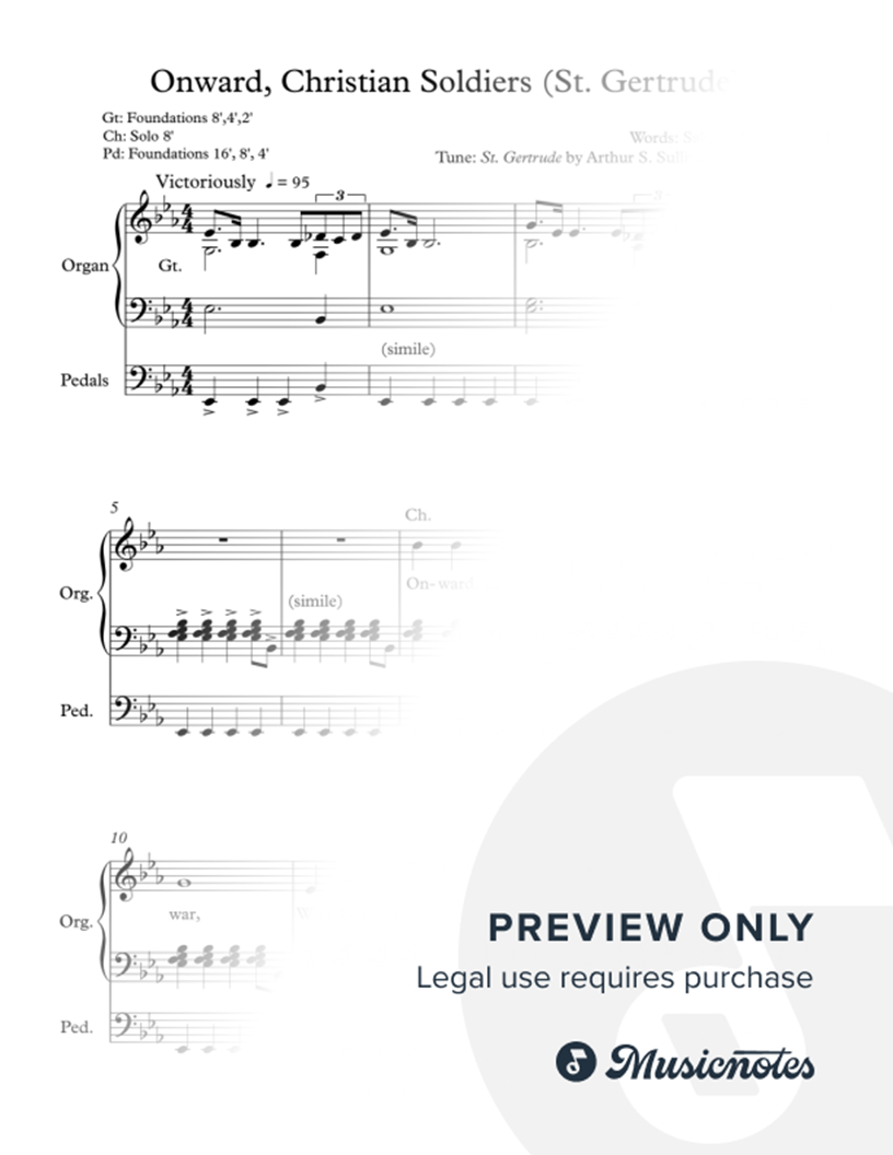 This is an organ solo arrangement of "Onward, Christian Soldiers (Tune: St. Gertrude)".
