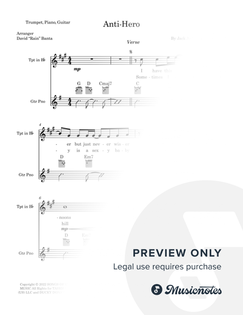 "Anti-Hero" Taylor Swift for Trumpet, Piano, and Guitar Mekdy, Lyrics, Chord Diagrams, Dynamics A Major