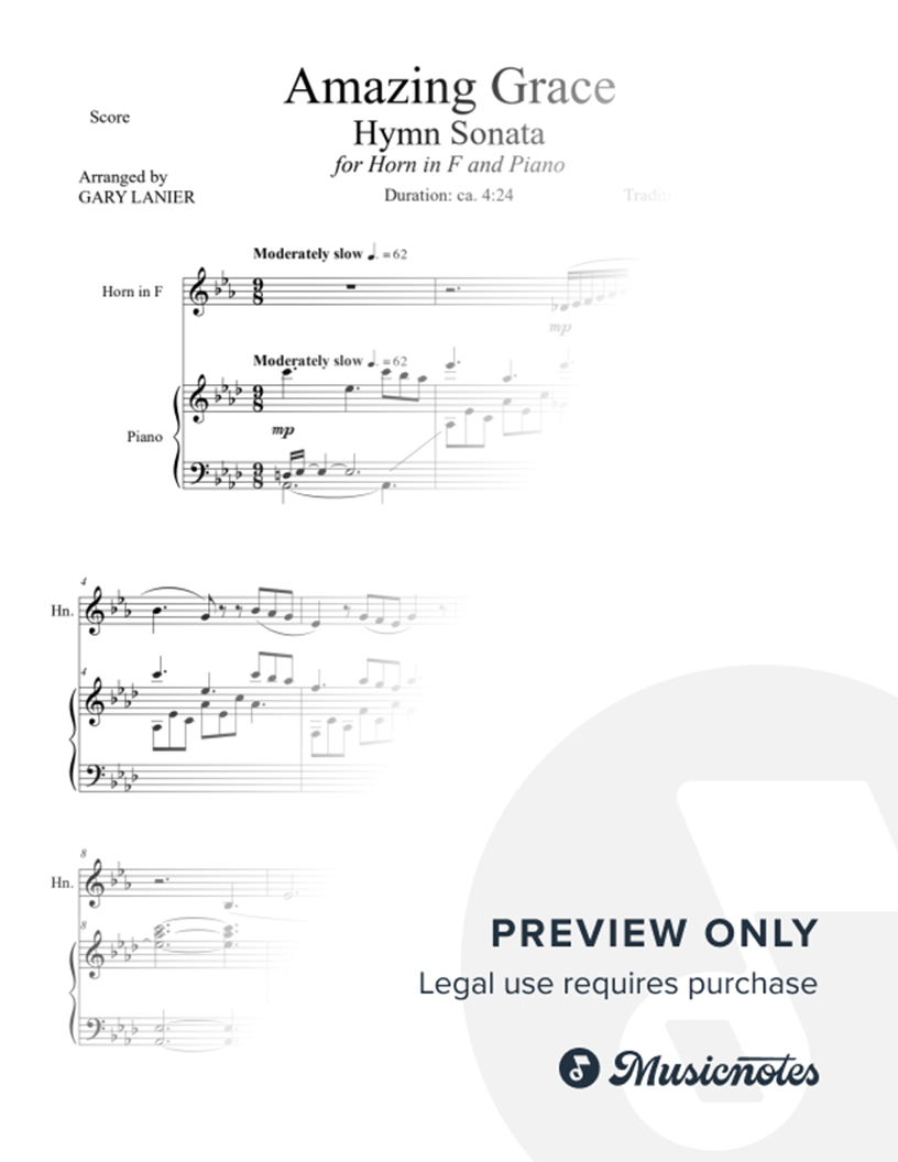 AMAZING GRACE Hymn Sonata (one movement) is a musical work by Gary Lanier for Horn in F and Piano of one of our most cherished Hymns. The theme is one of God's grace in all aspects of life. Perfect for Church services, recitals or any gathering where hymns of the grace and love of God is desired.
