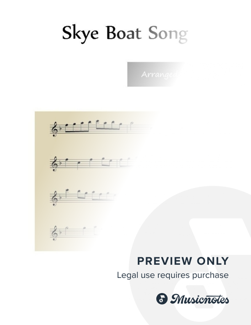 “Skye Boat Song” flute solo sheet music. Scottish folk song arranged by Lynette Auberjeunois for late beginner level. Digital download includes a one page flute solo and a three page piano score. Key: G and E minor. Range: D2 to D3. Published by Flute Files Publishing (FO70-1069).