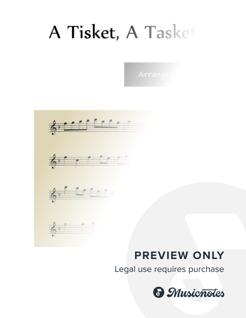 “A Tisket, A Tasket” flute duet sheet music. American nursery rhyme arranged by Lynette Auberjeunois for late beginner/early intermediate level. Download includes a two page flute duet score in the key of F. Range: Flute 1: F2 - D3, Flute 2: C2 - Bb2. Flute Files Publishing (FO72-1003).