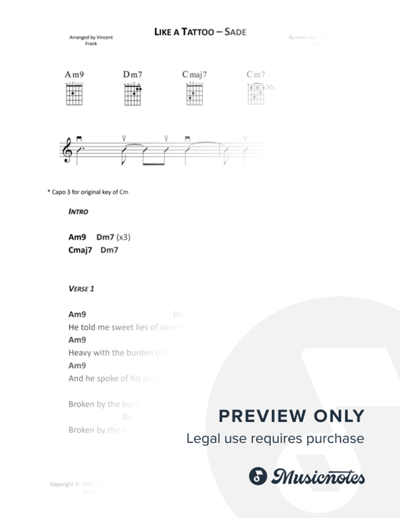Chord sheet arrangement of Sade's "Like a Tattoo" from the album Love Deluxe. Includes chord diagrams, strum pattern, lyrics, and chords. Written in key of Am for easier chord shapes, original key of Cm can be played using Capo 3. 2 pages.