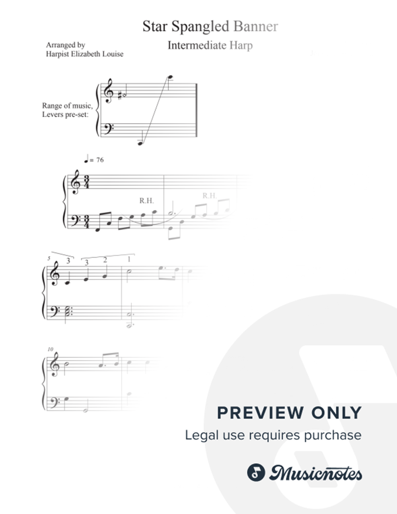 This arrangement is in the key of C Major and can be played on lever or pedal harp. It is notated for lever harp, but can easily be played on pedal harp. It is an intermediate version with a few fingerings written in.
