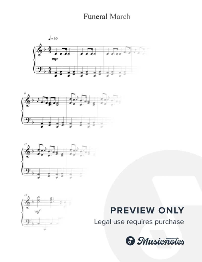 From the third movement of Chopin's Sonata No. 2 in B-flat Minor, this is the Funeral March arranged for solo piano. Great for lessons, recitals, somber occasions, or even as a practical joke on someone's birthday. Intermediate level.