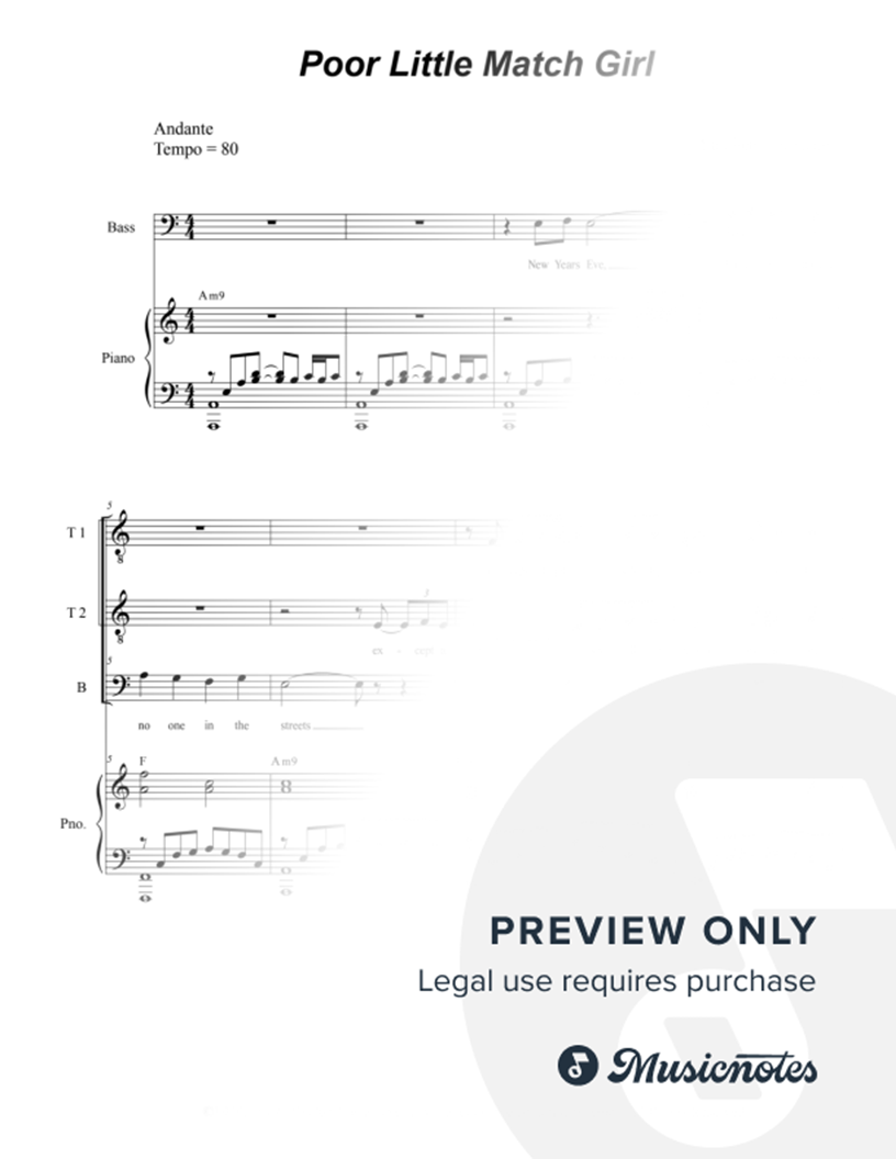 Moving Christmas song that is based on the story of the Little Match Girl by Hans Christian Anderson which is scored for TTB with Piano accompaniment. Accessible and appropriate for any concert setting. Price includes a 5-copy limit print license.