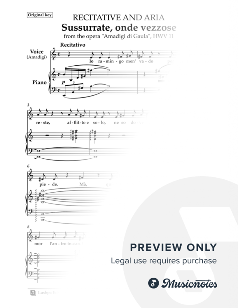 Transposed original key (F major) to E major. Italian language (original). Score includes recitative "Io Ramingo men' vado..." (Amadigi) Recitative and aria from the Handel's opera "Amadigi di Gaula", HWV 11