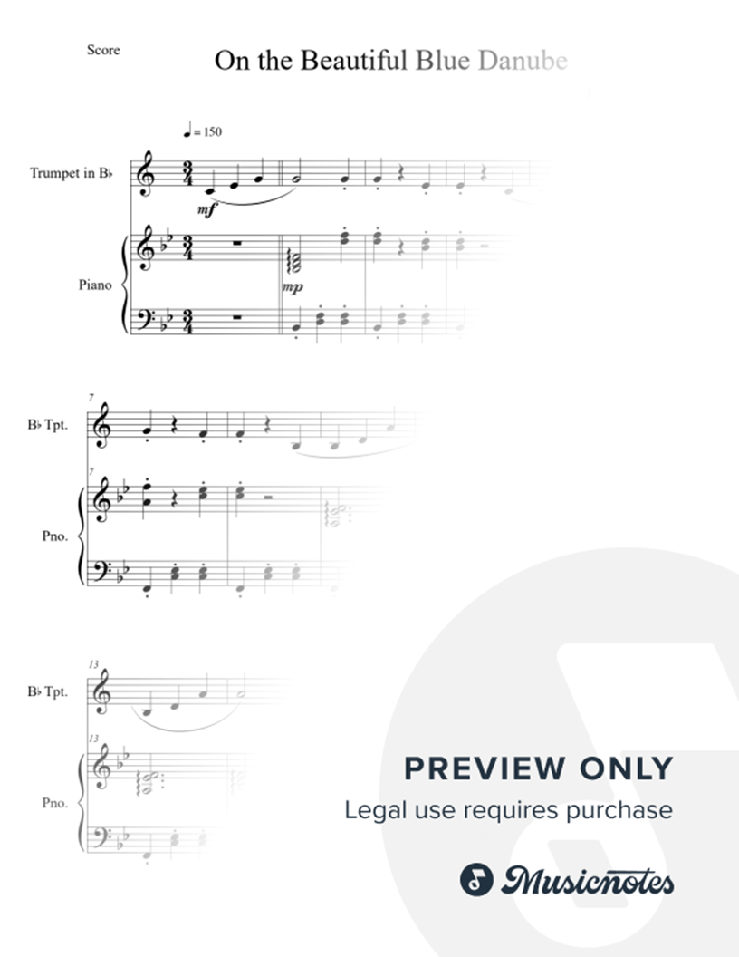 Austrian composer Johann Strauss Jr.'s famous waltz "An der schönen blauen Donau," aka The Blue Danube: arranged for B-flat trumpet solo with piano accompaniment. Great for lessons, recitals, and performances of all kinds. Intermediate level. Includes score and parts.