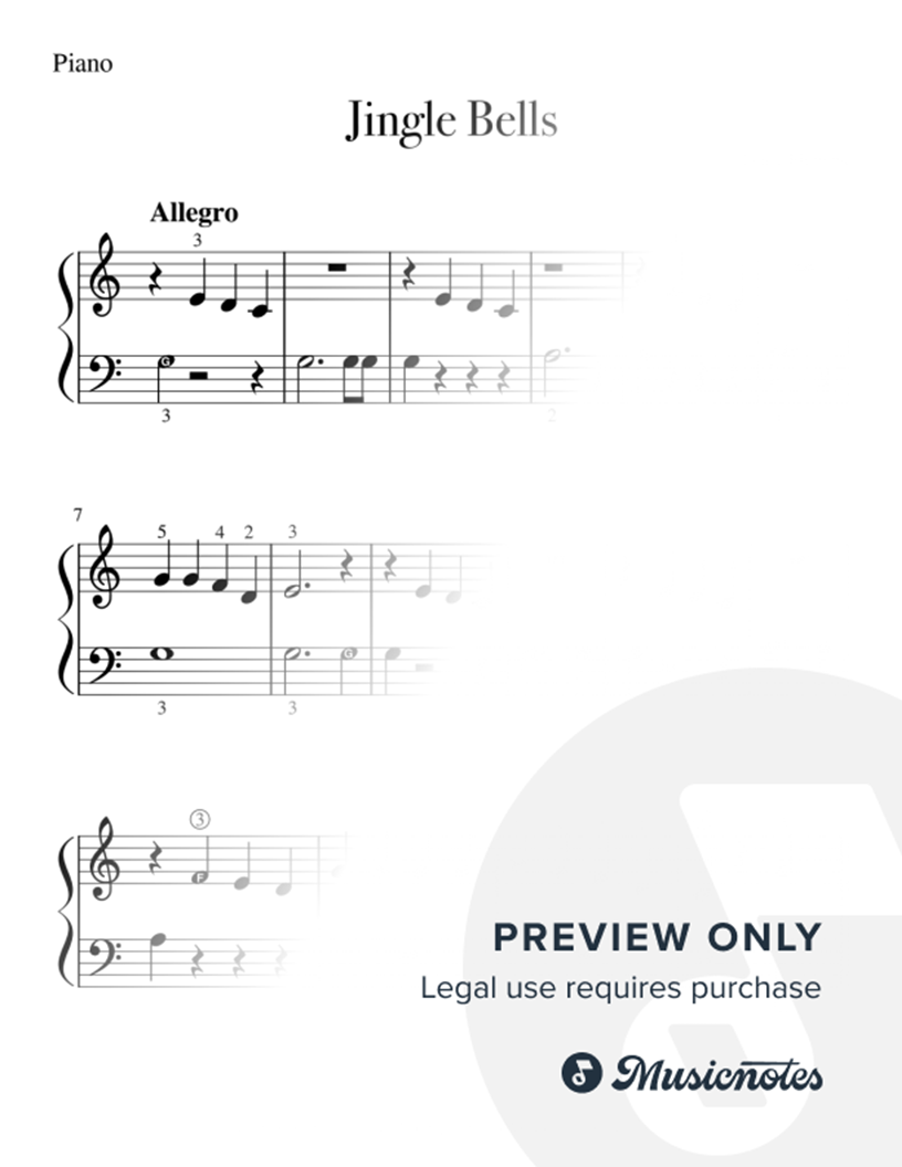 Easy version of Jingle Bells for piano solo. Includes lyrics and fingerings.