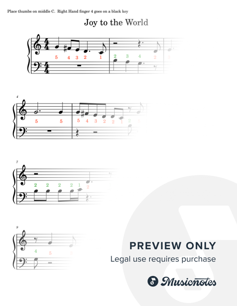 This music is arranged to be able to be played without knowing how to read music yet. The Red finger numbers indicate that the Right hand will be playing, and the Green finger numbers indicate that the left hand will be playing.