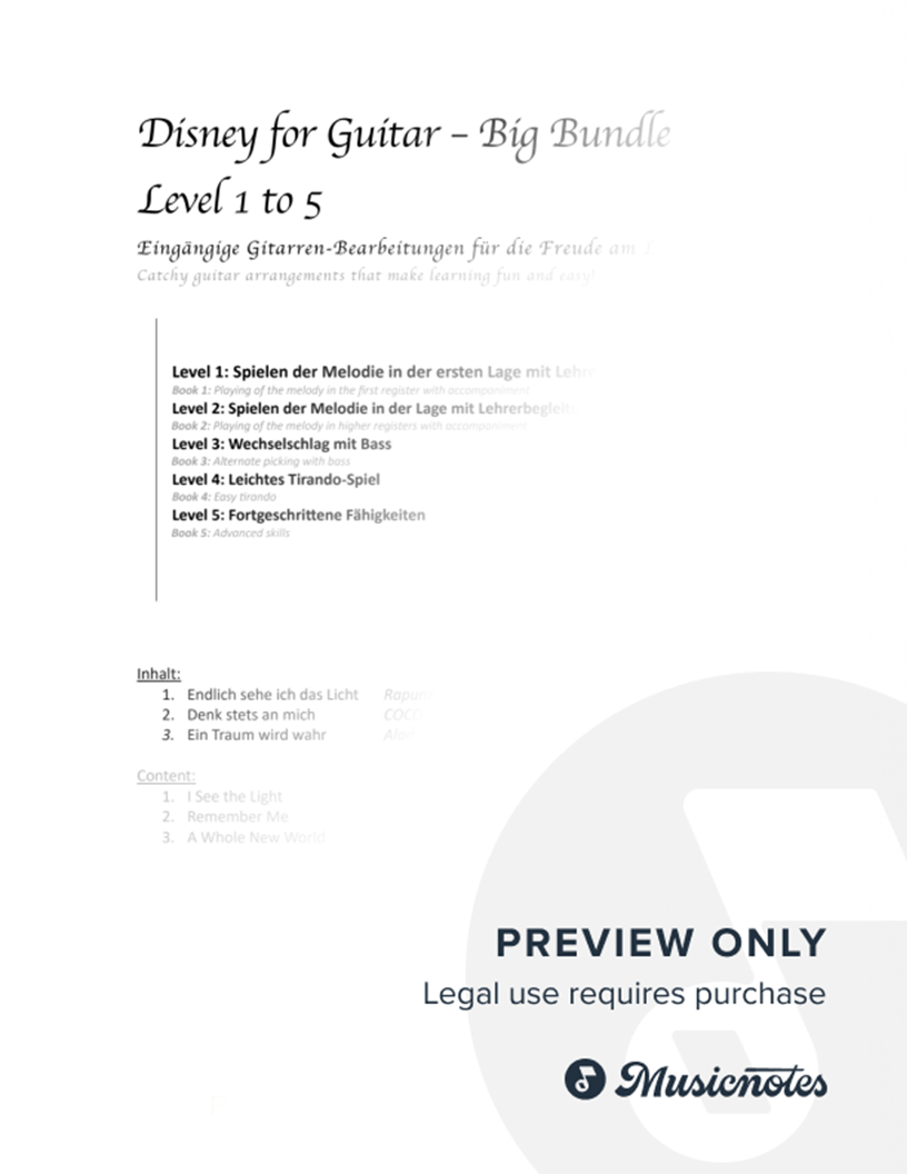 You will get 3 Disney-Songs in five different versions from Level 1 to 5: I See the Light from Tangled, Remember Me from Coco and A Whole New World from Aladdin. All notes are included with and without tabs. Visit my Homepage for more Information via Youtube.