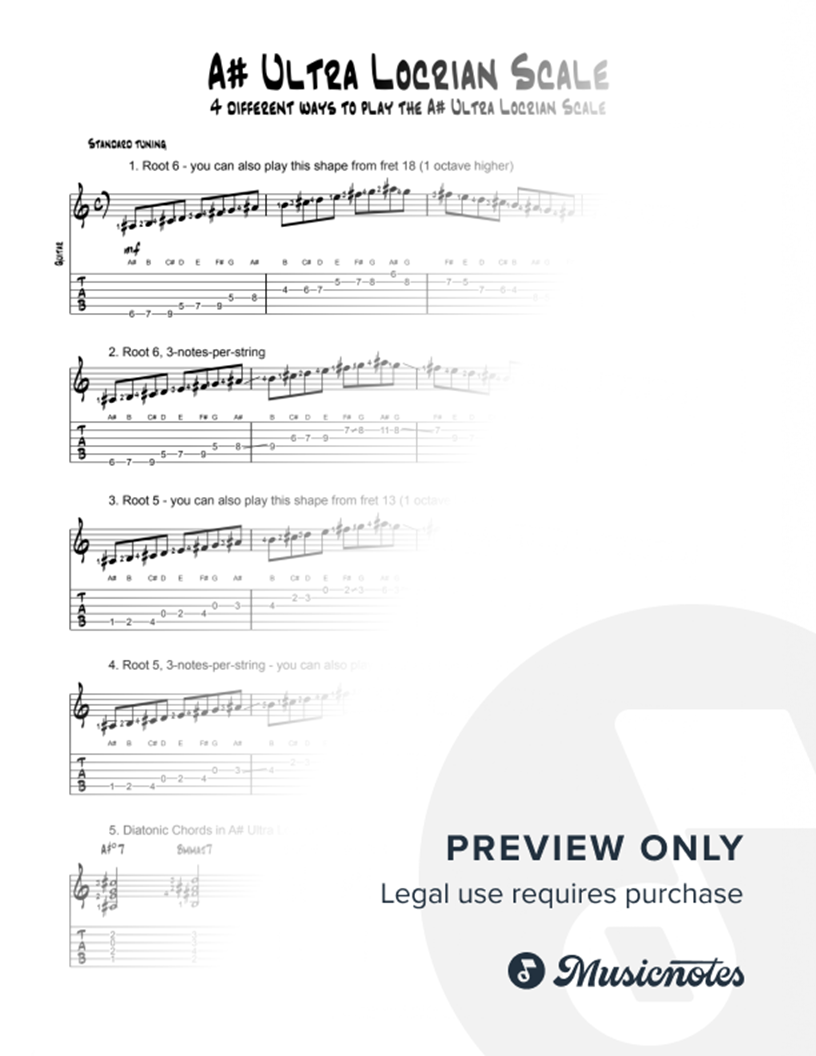 This sheet shows guitarists 4 different ways to play the A# Ultra Locrian Scale: