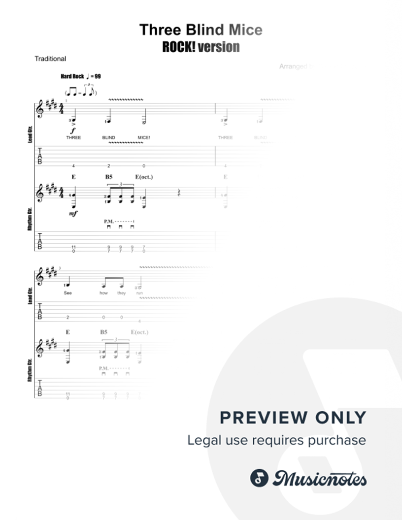 A dual guitar hard rock version of Three Blind Mice. The lead guitar part plays the melody in the lower range of the guitar, while the rhythm guitar part plays a chugging power chord accompaniment before harmonising the melody in the last part of the song. A new take on an old classic.