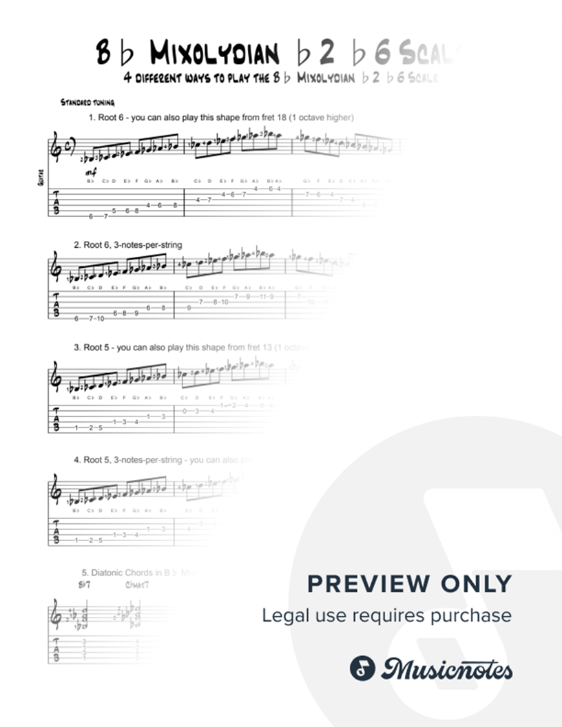 This sheet shows guitarists 4 different ways to play the Bb Mixolydian b2 b6 Scale: