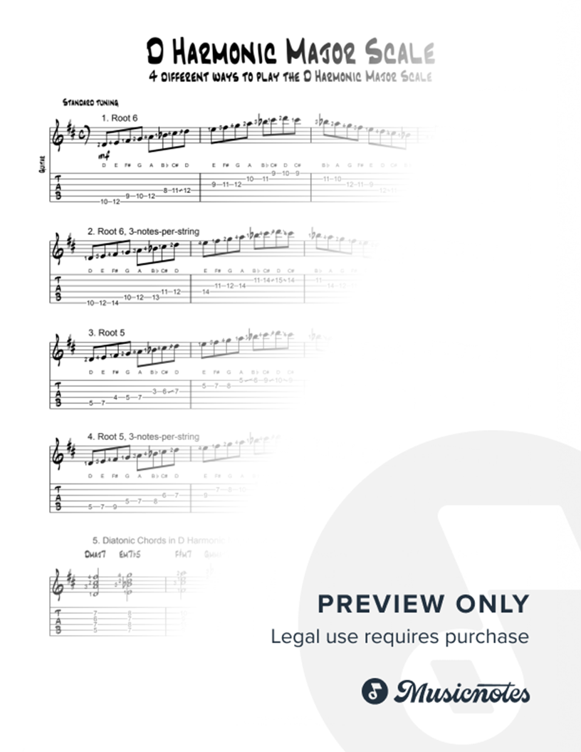 This sheet shows guitarists 4 ways to play the D Harmonic Major Scale: