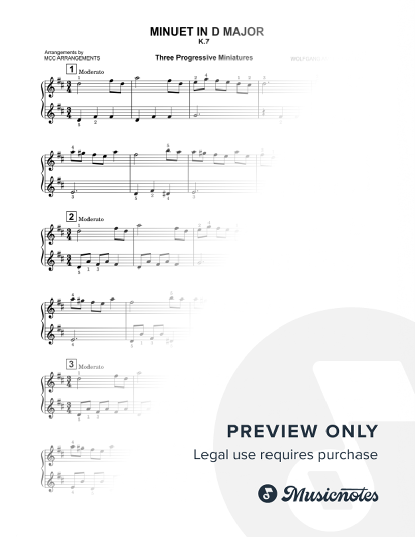 Three progressive piano miniatures of Mozart's ‘Minuet in D’ for beginner and advancing beginner players. Short student versions for developing music literacy skills. Great for sight-reading practice. Includes fingering. From the ‘Three Progressive Miniatures Collection’ by MCC Arrangements