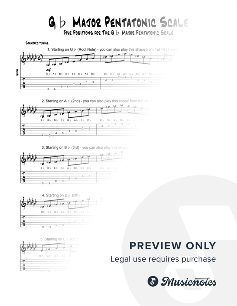 This sheet shows guitarists five separate positions for playing the notes of the Gb Major Pentatonic Scale.