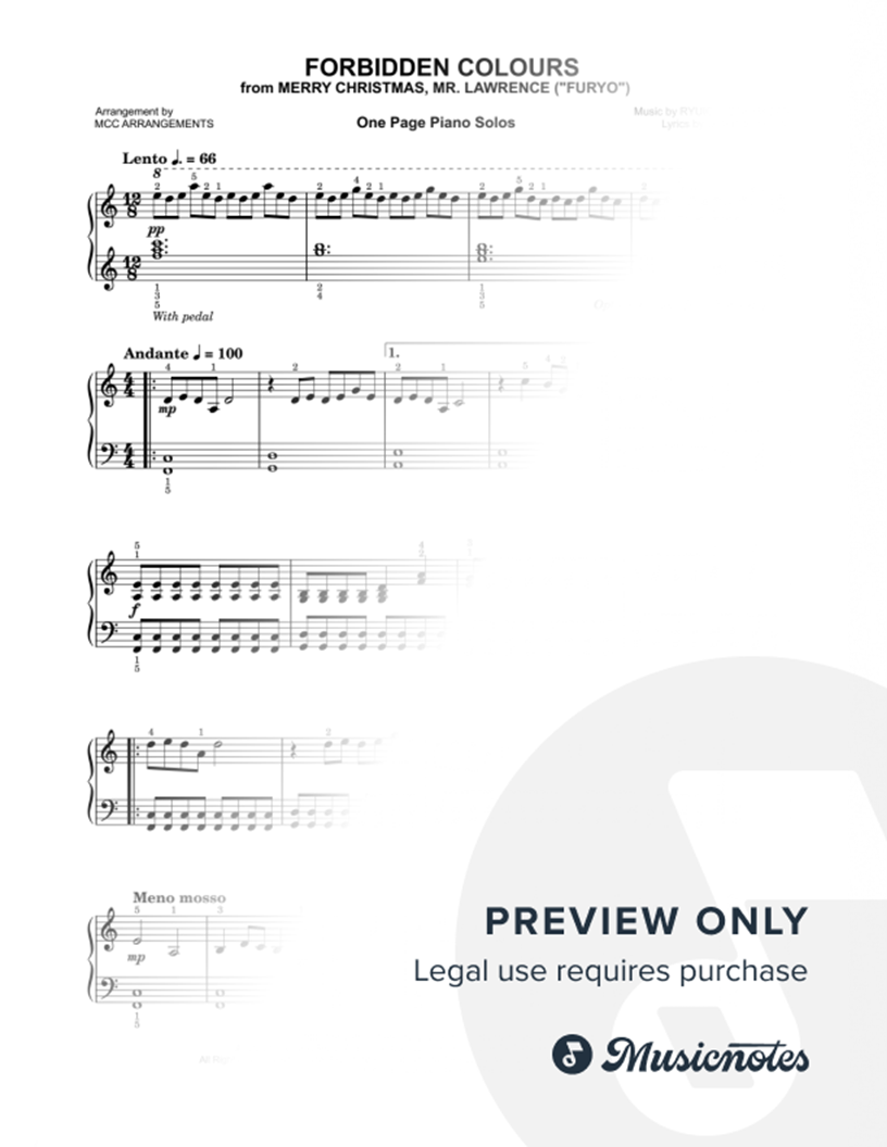 A one-page piano solo reduction of Ryuichi Sakamoto's 'Merry Christmas, Mr. Lawrence' for early intermediate players. A short version for developing music literacy and technical skills. Great for building repertoire. Includes fingering. From the ‘One Page Piano Solos Collection’ by MCC Arrangements.