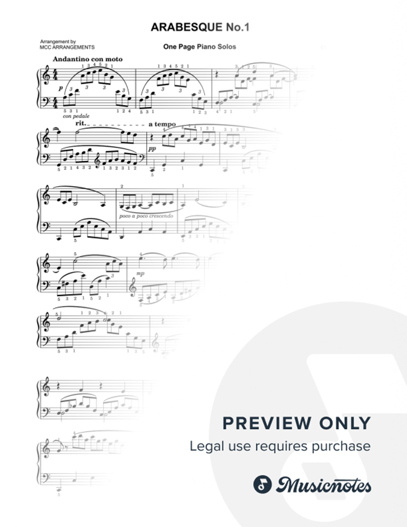 A one-page piano solo reduction of Debussy's 'Arabesque No.1' for early intermediate players. A short student version for developing music literacy and technical skills. Great for building repertoire. Includes fingering. From the ‘One Page Piano Solos Collection’ by MCC Arrangements.
