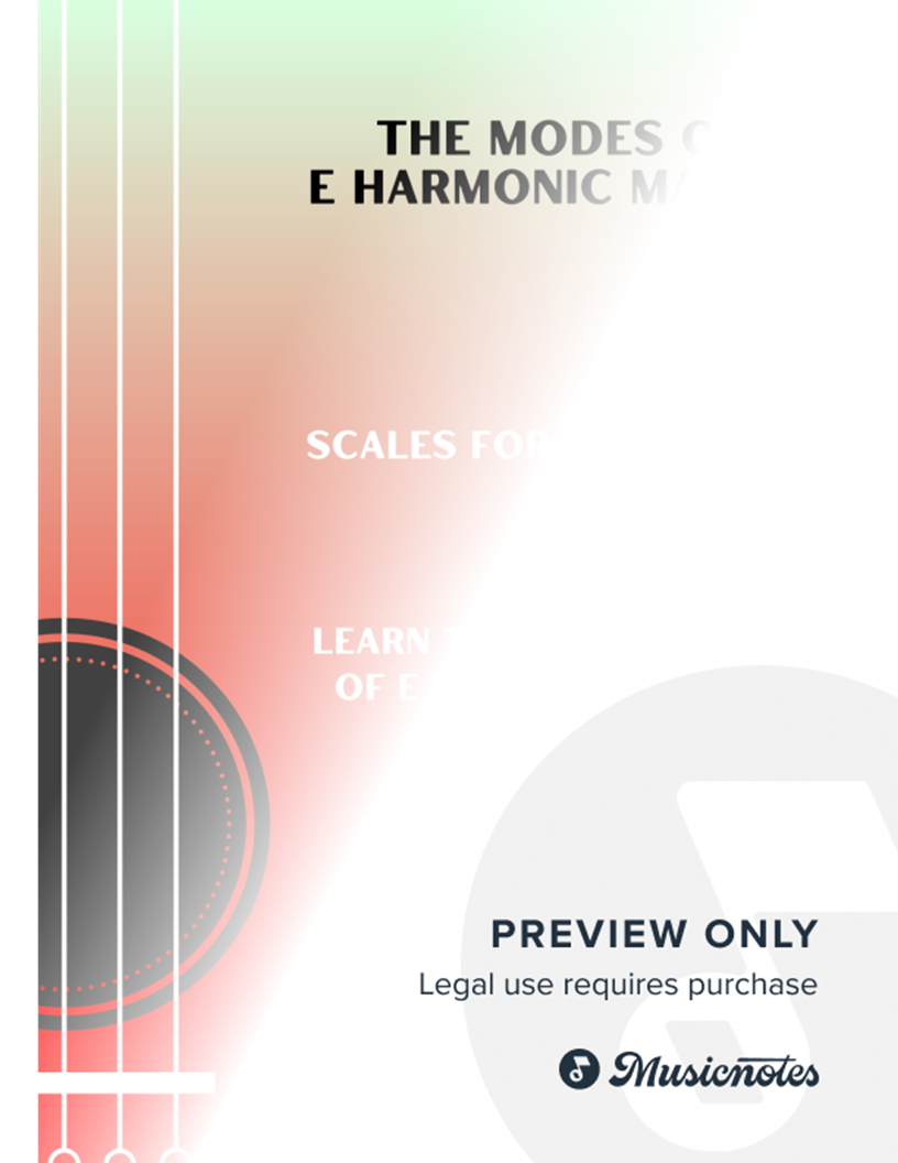 These info sheets show guitarists how to play all of the 7 Modes of E Harmonic Major, in a variety of positions around the guitar neck. In standard notation and TAB, with note names and fingerings written into the score. All sheets also have the diatonic chords for each mode.