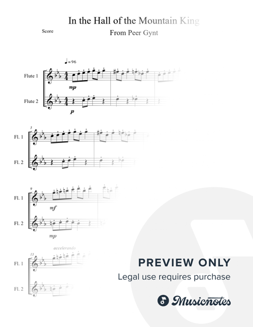 Originally from the play Peer Gynt, this is Edvard Grieg's "In the Hall of the Mountain King" arranged for two flutes. Great for lessons, recitals, and performances of all kinds. Easy intermediate level. Includes score and parts.