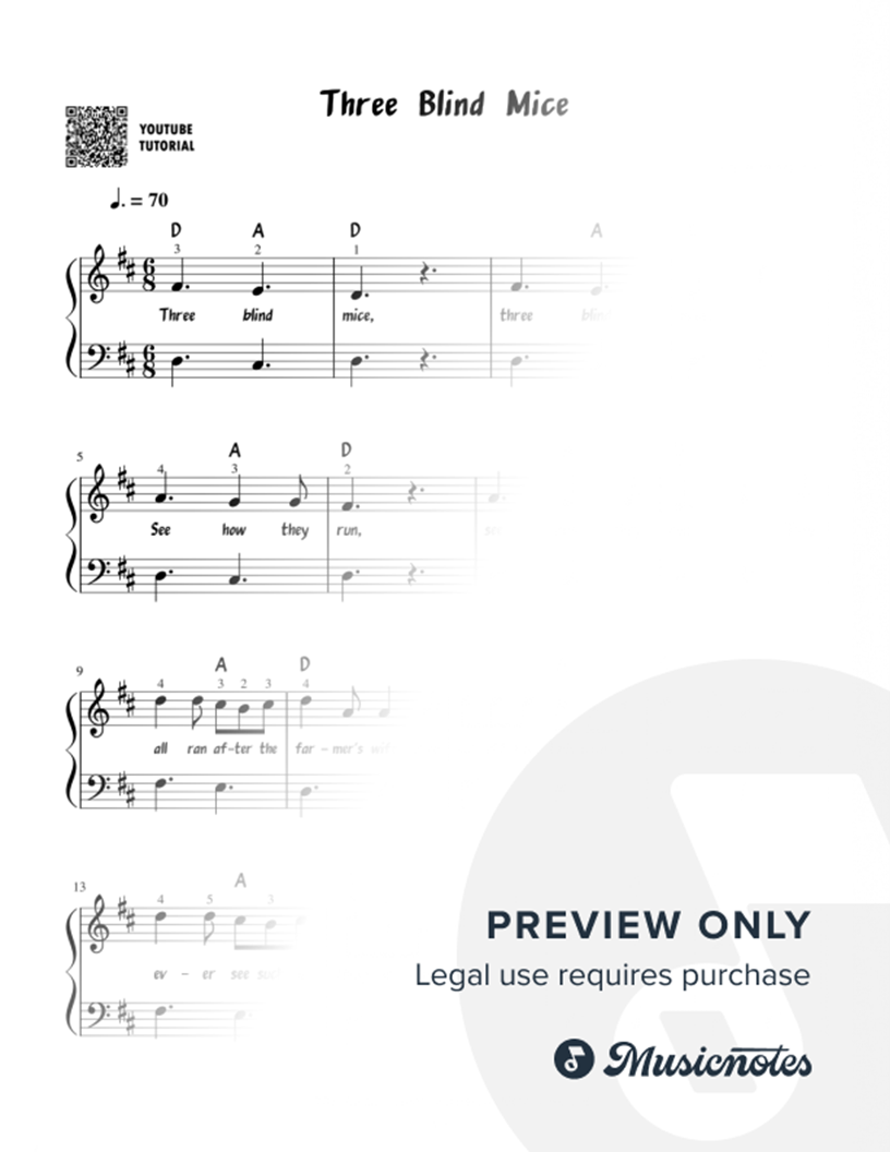 Three Blind Mice | Easy Piano Sheet Music| Children's Song | Easy Arrangement | Lyrics, Fingering, Chords Included | Beginner Version | Piano | Keyboard | Simple Sheet Music | Video Tutorial | Songs for Kids |