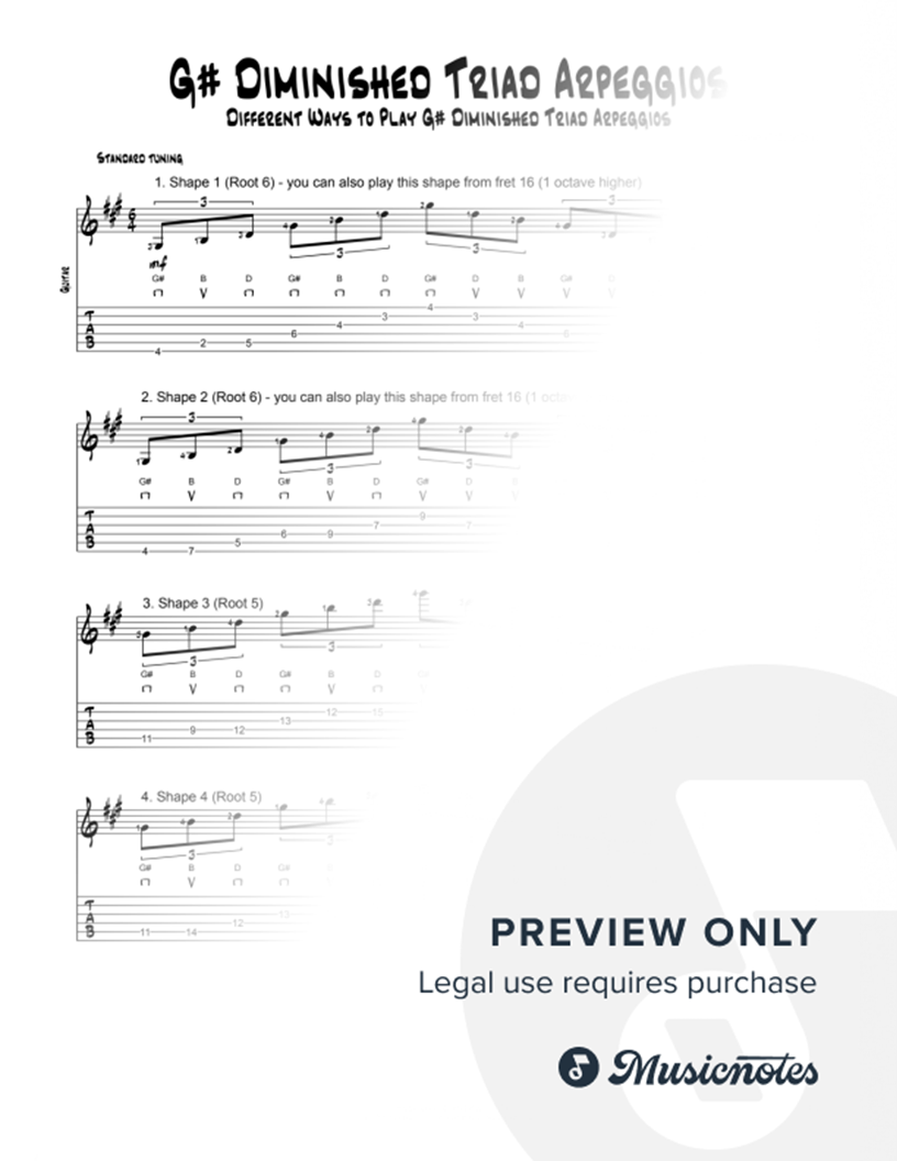 These info sheets show guitarists 5 different ways to play G# Diminished triad arpeggios on guitar. Plus an ascending and descending arpeggio exercise to build familiarity with the shapes, as well as five different chord voicings built from the arpeggio shapes.