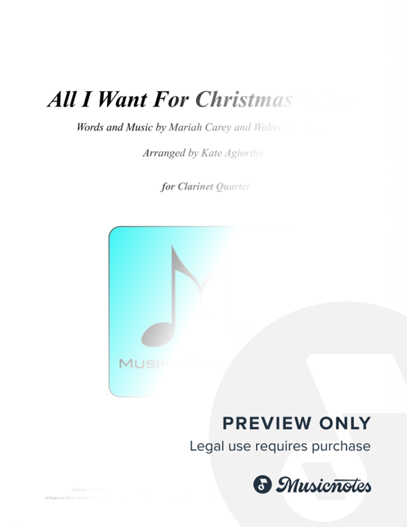 'All I Want For Christmas Is You', as made famous by Mariah Carey. Add this lively tune to your holiday performance repertoire. Arranged for Clarinet Quartet by Kate Agioritis