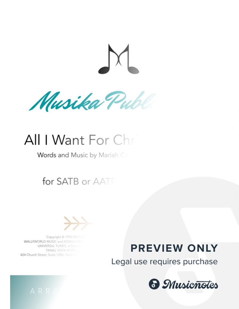 A Saxophone Quartet Arrangement of Mariah Carey's hit Christmas song 'All I Want For Christmas Is You'. Scored for SATB or AATB Sax Quartet, add this lively tune to your holiday performance repertoire. Download includes a score and full set of parts.