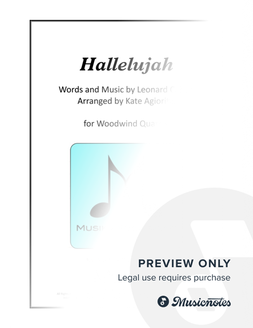 Leonard Cohen's immortal hit 'Hallelujah' arranged for Woodwind Quartet by Kate Agioritis. Download includes a score and a full set of parts.