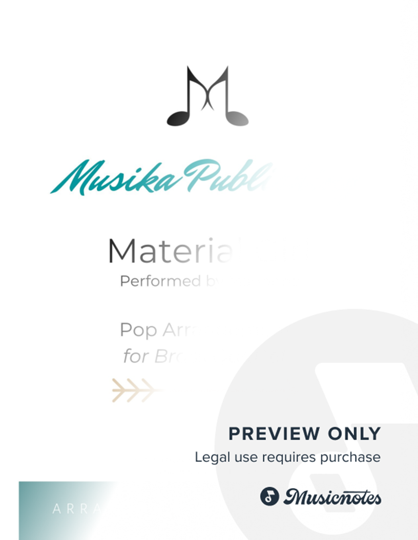 A fun pop arrangement of Madonna's hit single 'Material Girl' arranged for Brass Quartet (2 Trumpets, Horn or Trombone, Tuba/Bass Trombone) by Kate Agioritis.