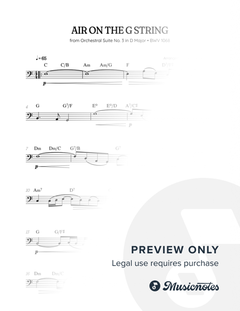 With this arrangement of Bach's Air on the G String from from Orchestral Suite No. 3 in D Major • BWV 1068, you'll be able to play this fantastic melody with ease and grace.