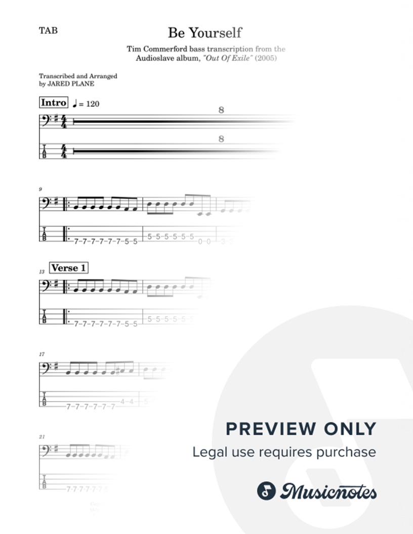 Tim Commerford's original bass line as played on the Audioslave song, "Be Yourself" released on the 2005 album, "Out Of Exile". This bass line is brought to life with the (optional) use of a bass overdrive pedal such as the Boss ODB3. This transcription comes with Standard Notation and bass TAB.