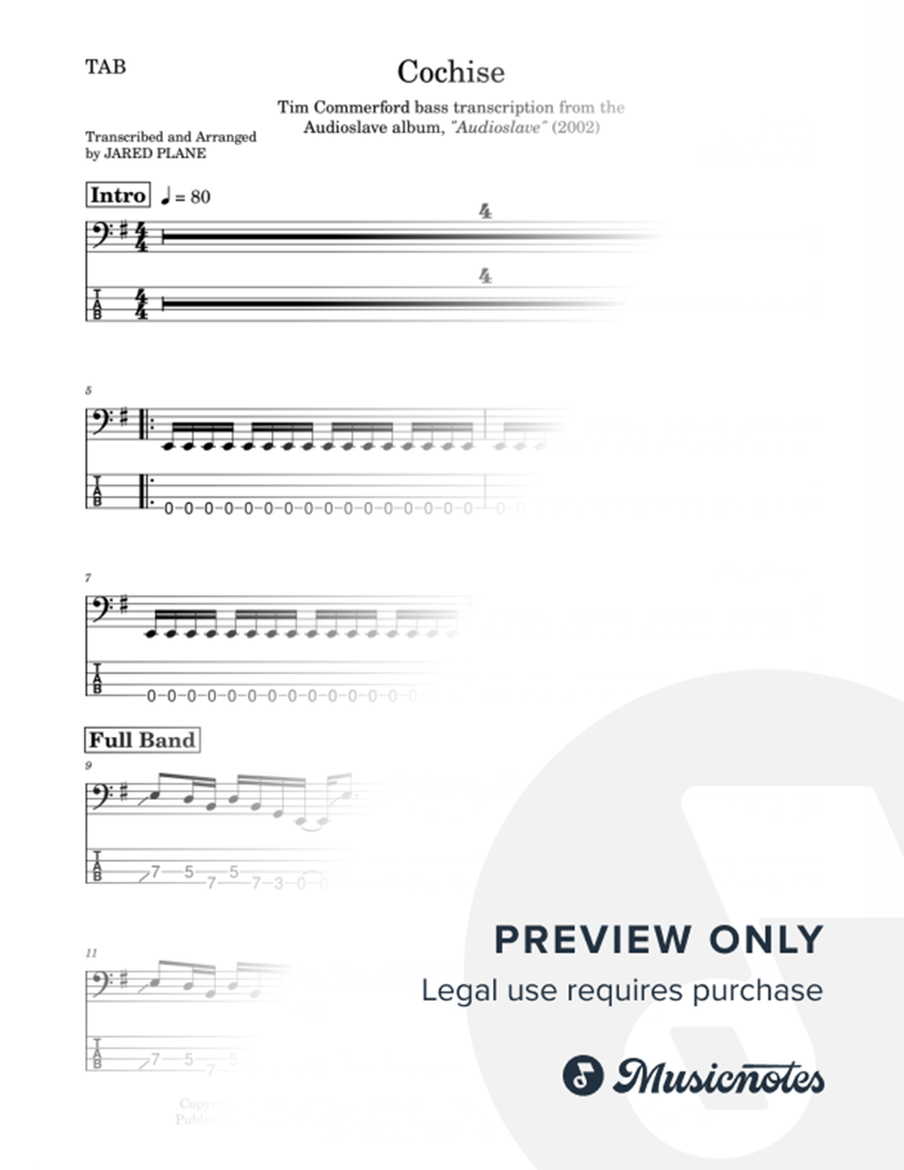 Tim Commerford's original bass line as played on the Audioslave song, "Cochise" released on the 2002 album, "Audioslave". This bass line is brought to life with the (optional) use of a bass overdrive pedal such as the Boss ODB3 and wah-wah pedal. This transcription comes with bass TABs.