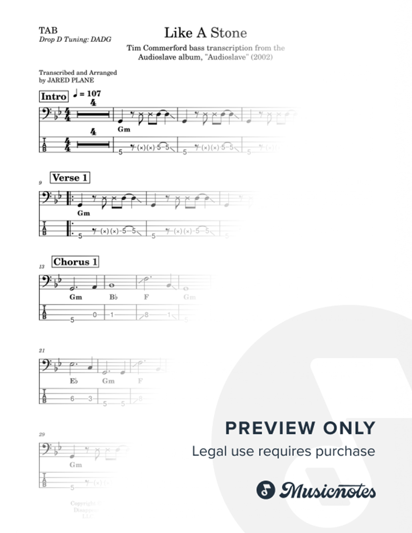 Tim Commerford's original bass line as played on the Audioslave classic, "Like A Stone" released on their 2002 self-titled album, "Audioslave". This bass line features an alternate form of bass guitar tuning known as, "Drop D Tuning". This transcription comes with bass TABs and chord symbols.