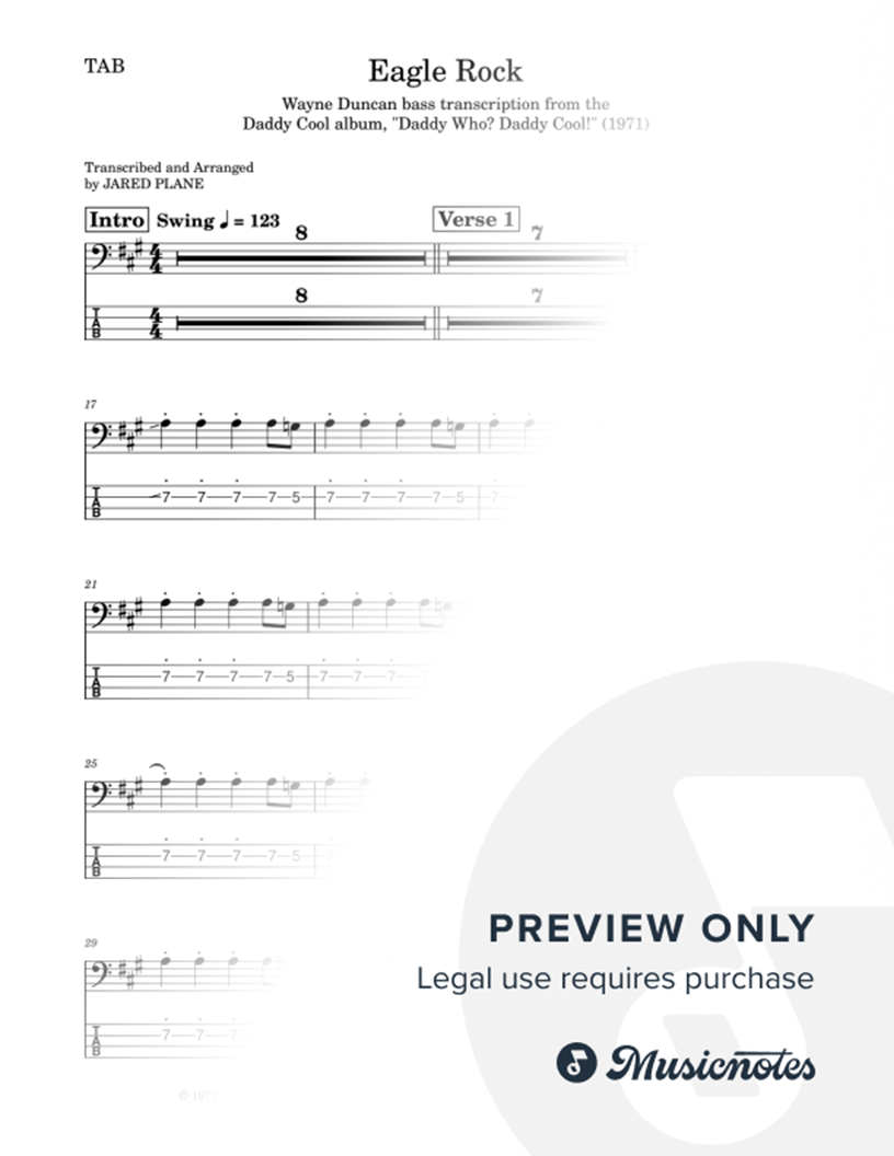 Wayne Duncan's original bass line as played on the Daddy Cool song, "Eagle Rock" released on their 1971 album, "Daddy Who? Daddy Cool!". This transcription comes with Standard Notation and bass TABs.